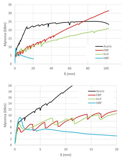 En términos de resistencias últimas, el FRP muestra la mayor resistencia, seguido por el acero y luego H+F. Aunque el FRP no es dúctil, las deformaciones cercanas a la rotura son significativas, similares a las del acero antes de romperse.